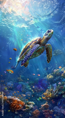 Sea turtle in a vibrant undersea landscape. Majestic sea turtle glides through a sunbeam-filled underwater scene rich in marine flora and fauna