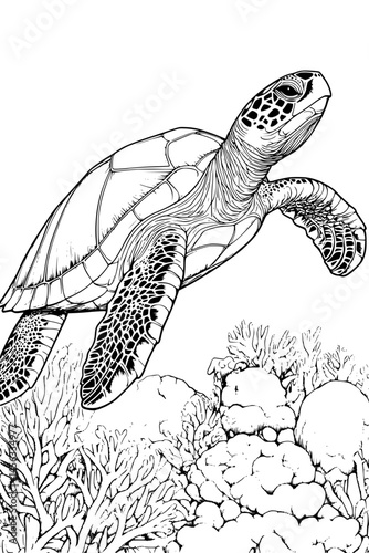 Sea Turtle Swimming Near Coral Reef, coloring book style, vector illustration art