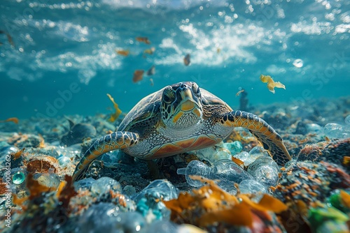 Sea turtle swims in a plastic-polluted ocean water. AI generated