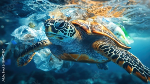Sea turtle swims near ocean surface. Plastic trash floating. Marine animal swimming in polluted waters. Environmental problem. Ocean pollution.