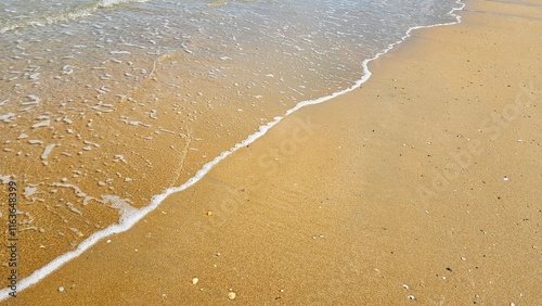 Sea water wave and sand beach with seashell background for decoration on summer holiday and coastal concept.