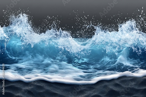 Sea wave on black sand beach with splashes of water, close up