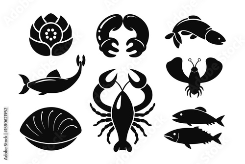 Seafood and Aquatic Life Black Silhouette Set Lobster Crab Claws Fish Shrimp Clam and Lotus Flower in a Simple Bold Style for Seafood Restaurant or