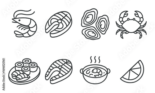 Seafood icons: shrimp, salmon, oyster, crab, sushi, soup, lemon slice illustrations