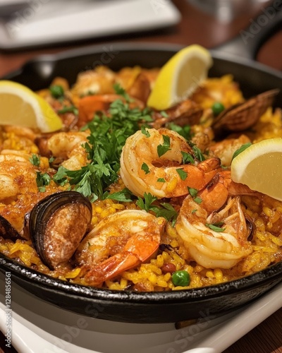 Seafood paella served in a cast-iron skillet, garnished with fresh parsley and lemon wedges,