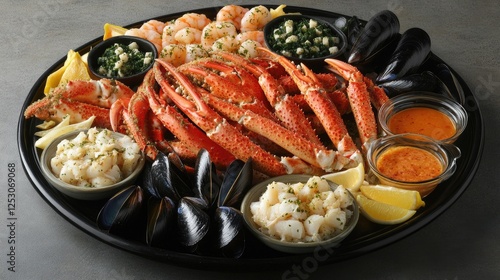 Seafood platter with crab legs, shrimp, mussels, and sauces. Perfect for parties or celebrations