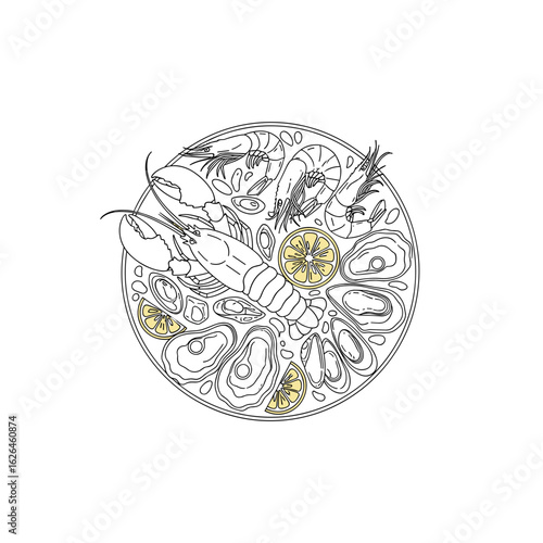 Seafood platter with lobster, shrimp, and oysters decorated with lemon isolated on transparent background