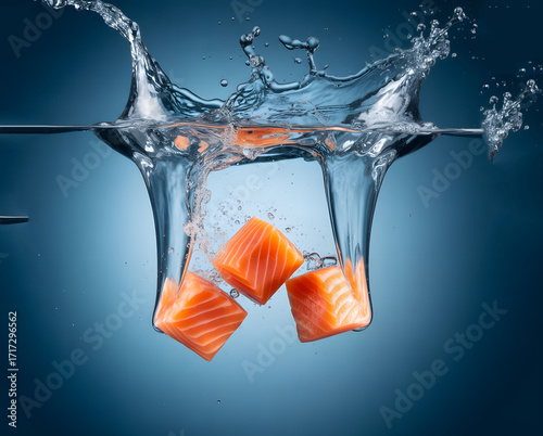 Seafood Salmon Cubes Underwater Splash Freeze Frame Photography