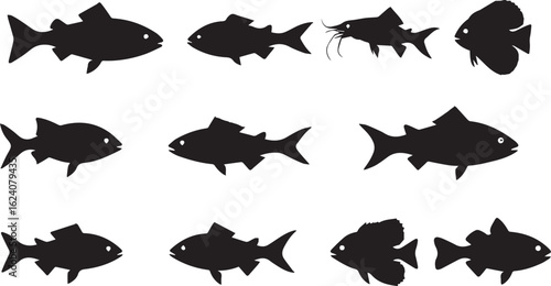 Seafood silhouette icon set. fish, seafood varieties collection in silhouette style.