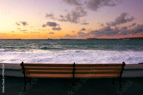 Seafront against sea with surf at sunset