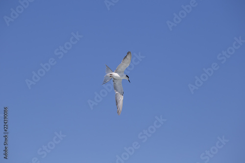 Seagull flying under blue sly