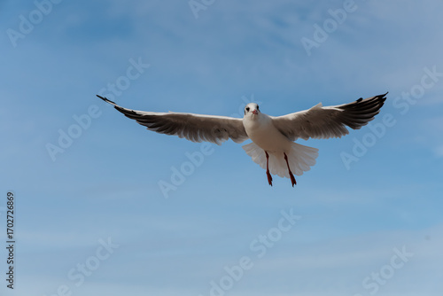 Seagull in flight against a blurry blue sky with a light cloud cover