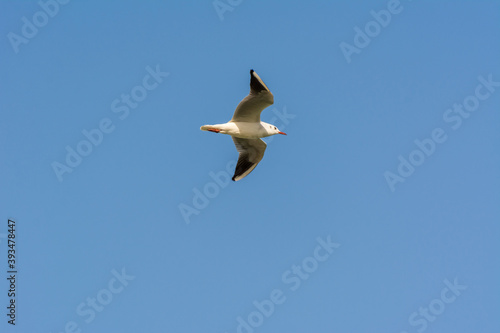 Seagull is flying in sky over the sea waters in corniche park, Dammam, Saudi Arabia