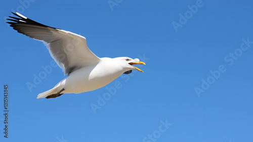 Seagull squawking with open beak against blue sky, ideal for nature projects