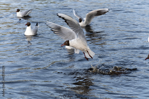 Seagulls snatch bread from each other in the city pond