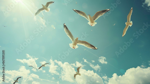 Seagulls soar gracefully in a clear blue sky, with sunlight streaming through, creating a bright and serene atmosphere. Fluffy clouds dot the horizon.
