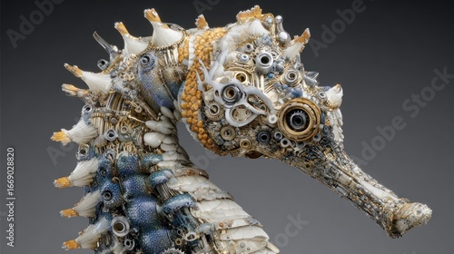 Seahorse sculpture art crafted from recycled components, intricate detailing, textural contrast