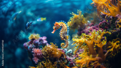 Seahorse swims through a reef filled with colorful corals and marine plants. The diverse underwater habitat showcases a variety of hues and textures, creating a lively scene in the ocean