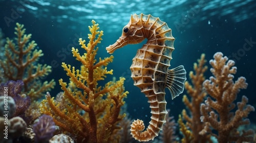 Seahorse underwater with corals and algae, marine life concept.