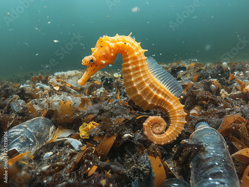 Seahorse underwater with plastic waste garbage swimming in a polluted ocean water close up