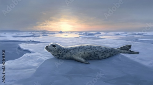 Seal Resting on Ice with Beautiful Sunrise in the Background