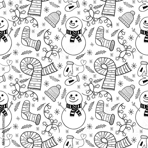 Seamless Сhristmas pattern in monochrome. Digital drawing of warm clothes, a snowman and a holly for postcards, scrapbooking, wrapping paper, fabrics and more.