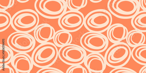 Seamless abstract pattern featuring hand drawn circular shapes on a coral, orange background. Plain ornament print for modern textiles, gift wrapping, wallpapers, branding, and stationery design.