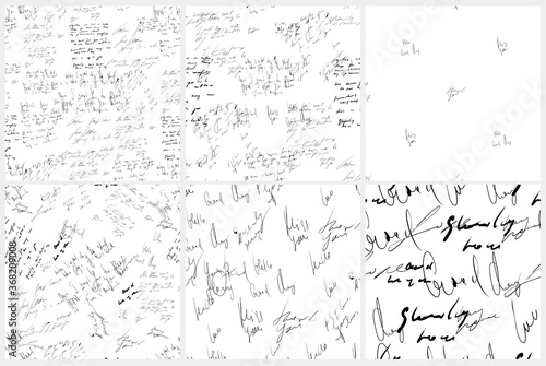 Seamless abstract text pattern set. Handwritten font on a white background. Ink on paper
