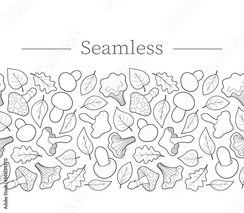 Seamless autumn border with mushrooms and leaves, outline.