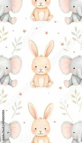Seamless baby animal pattern with cute pastel illustrations of baby elephants, bunnies, and bears, soft colors, hand-drawn style, perfect for nursery and baby products