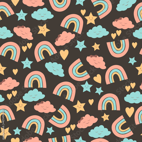 Seamless baby background with rainbow, clouds and stars. Vector. For printing on clothing, fabric, baby bedding, wrapping paper