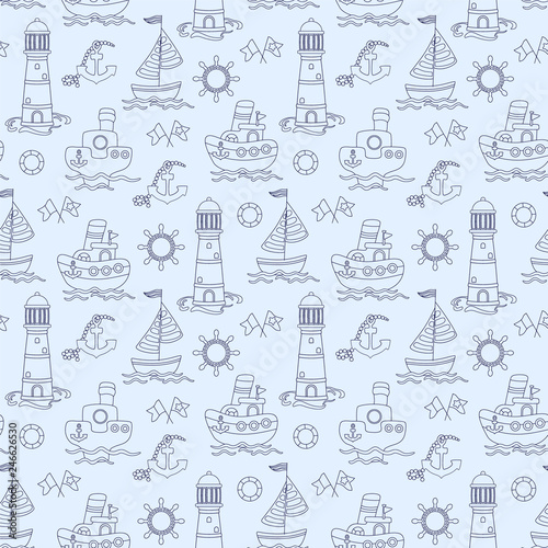 Seamless baby pattern with cute shps in ocean. Vector bright illustration with boats in the sea for kids. Seamless childrens background for wallpapers or textile.
