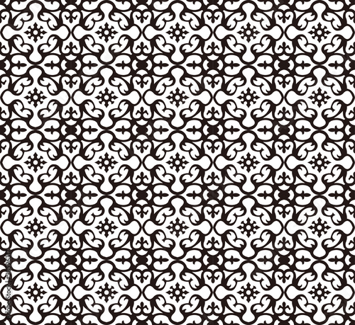 Seamless background image of vintage black white spiral kaleidoscope flower pattern.
