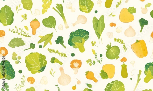 Seamless Background of Light Green Line Drawings of Vegetables on White Background