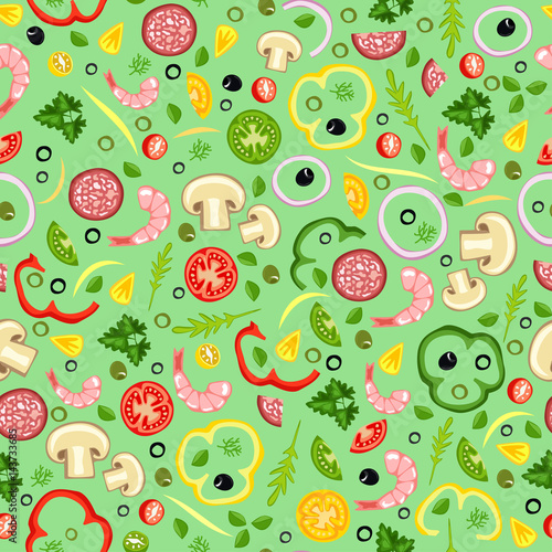 Seamless background of pizza ingredients. Delicious pattern