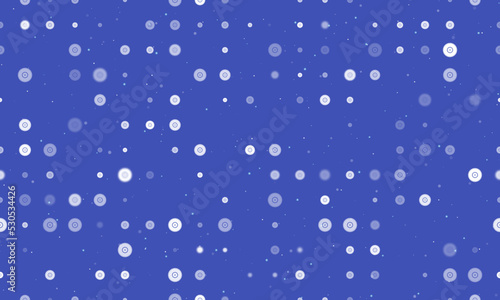 Seamless background pattern of evenly spaced white gramophone record symbols of different sizes and opacity. Vector illustration on indigo background with stars