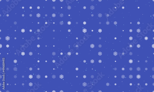 Seamless background pattern of evenly spaced white snowflake symbols of different sizes and opacity. Vector illustration on indigo background with stars