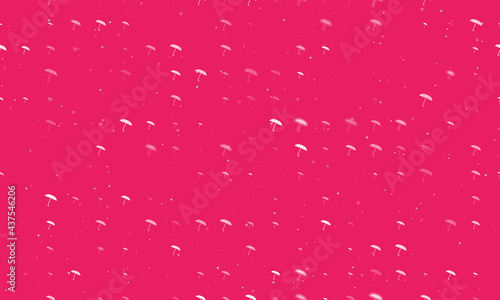 Seamless background pattern of evenly spaced white umbrella symbols of different sizes and opacity. Vector illustration on pink background with stars