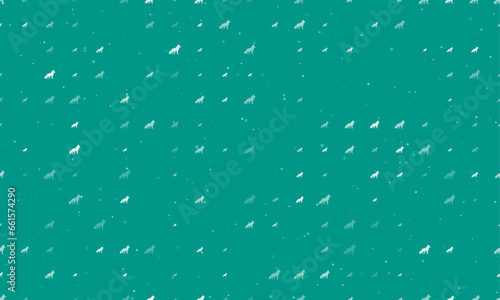 Seamless background pattern of evenly spaced white wolf symbols of different sizes and opacity. Vector illustration on teal background with stars