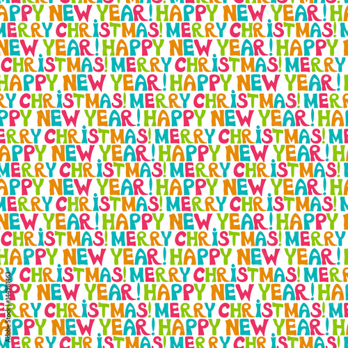 Seamless background with a print "Merry Christmas and Happy New Year". Pattern with letters. Use for wallpaper, printing on the packaging paper, textiles. Vector illustration.
