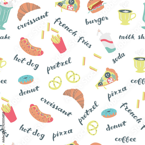 Seamless Background with Doodle Fast Food. Vector Illustration.
