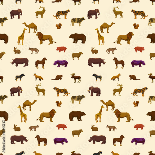 Seamless Big bundle of funny domestic and wild animals Collection of cute cartoon characters isolated on white background. Colorful vector illustration in flat style