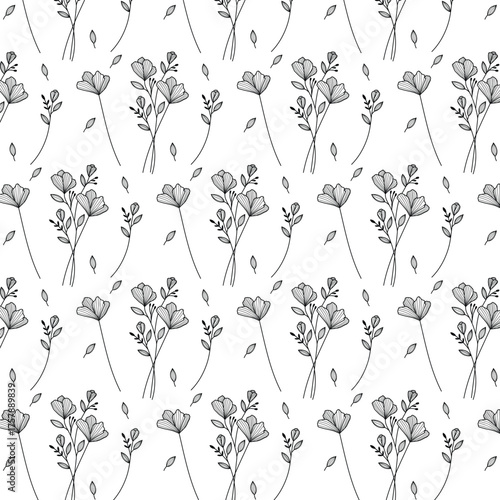 Seamless black and white floral pattern with delicate line art flowers and leaves