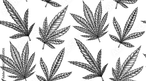 Seamless black and white pattern with leaves of marijuana with hatching. Vector engraving texture for fabrics, wallpapers and your creativity.