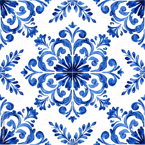 Seamless blue abstract pattern on a white background. A decorative textile print concept for fabric, tile, or wallpaper design with an ornate floral motif.