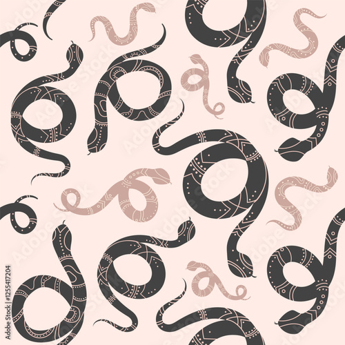 Seamless boho snake pattern with tribal ornamental details. Stylized snakes with intricate tribal and folk patterns. Abstract bohemian motif for fabric, print, wallpaper, web. Vector illustration