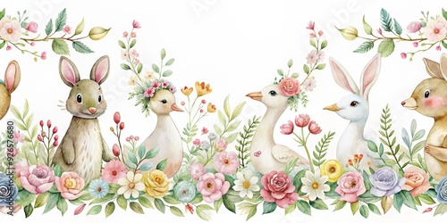Seamless border design featuring watercolour cute animals (rabbit, goose, bird) and floral elements, watercolour, seamless, border