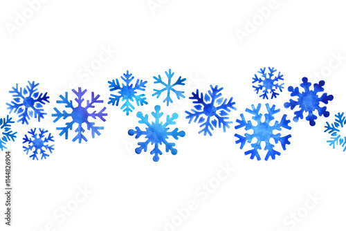 Seamless border of blue watercolor snowflakes on white background. Hand drawn watercolor winter seamless pattern. Holiday background design.
