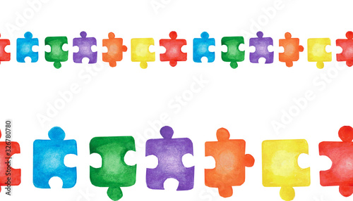 Seamless border with colorful jigsaw puzzles on white background. Watercolor hand drawn illustration