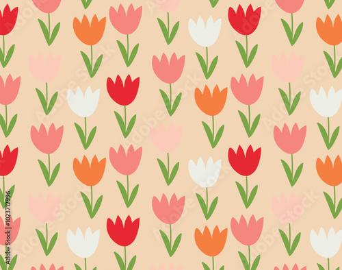 Seamless botany tulips pattern,vector illustration pink and green tulips background.